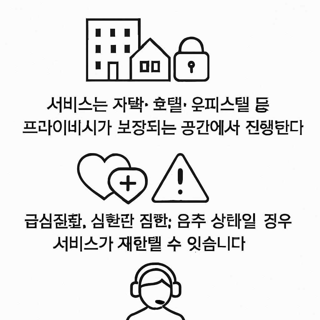 서비스는 자택·호텔·오피스텔 등 프라이버시가 보장되는 공간에서 진행됩니다.